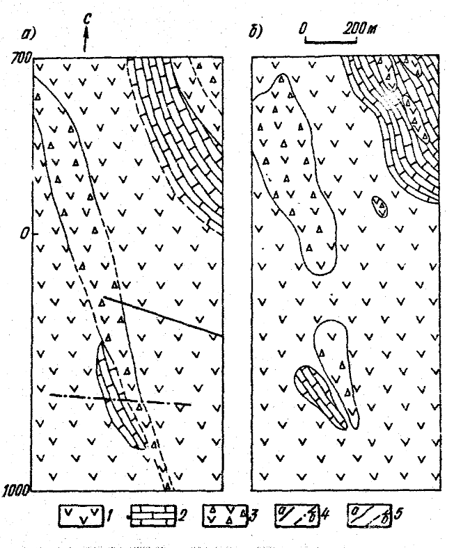 a - shematic geological map of the eastern part of site; b - results of classification of geophysical fields according to complex features: 1 - metabasalts; 2 - marbles; 3 - brecciation zone; 4 - fautls (a - traced, b - suspected); 5 - geological contacts (a - traced, b - suspected)