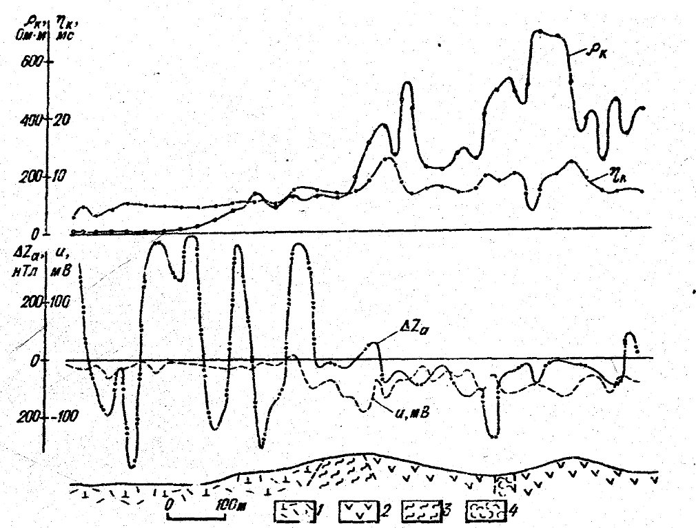 Fig. 2. The result of geophysical observations on one of the profiles in the western part of the site. 1 – basalt covers of Neogene-Quaternary age; 2 – metabasalts; 3 – chlorite shales; 4 - tufoslans