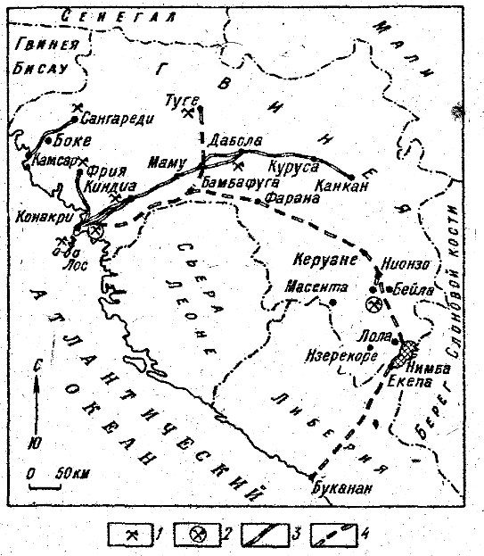 1 - bauxite deposits; 2 - iron deposits; 3 - railway; 4 - railway project.