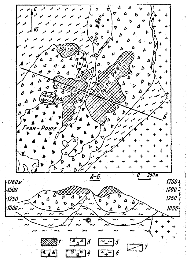 1 - rich iron ores (more than 60% Fe); 2 - ordinary iron ores (50-60% Fe); 3 - itaberites (less than 50% Fe); 4 - quartzites; 5 - crystalline schists; 6- granite gneiss; 7 - fractures.