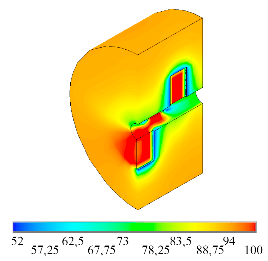 Fig.3. Permeability distribution under 5 MPa drawdown near the well with slotted perforation according to the computational model