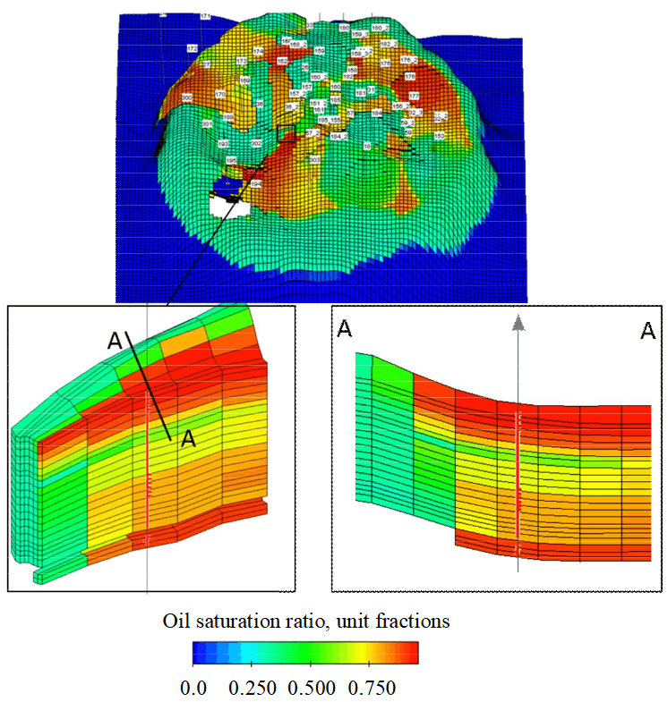 Fig.4. Distribution of current oil saturation in the 3D hydrodynamic model and direction of slotted channel formation