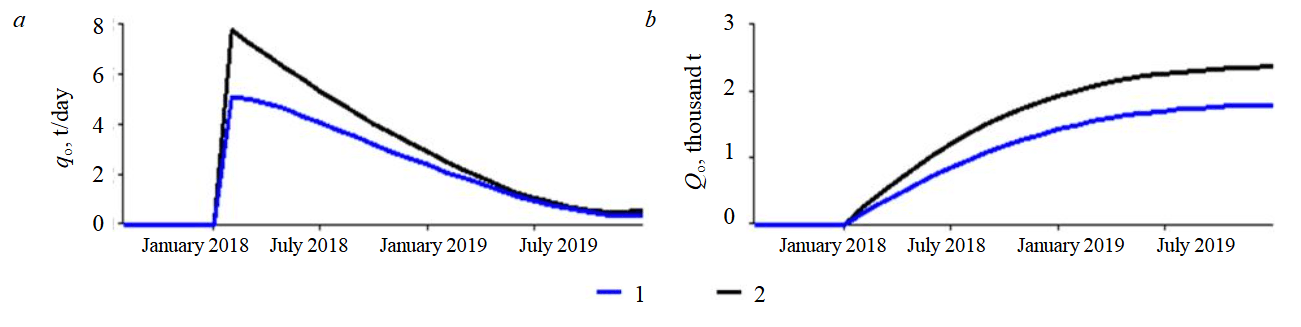 Рис.5. Parameters of well operation before and after OSHSP implementation: a is the oil flow rate; b is the cumulative oil production