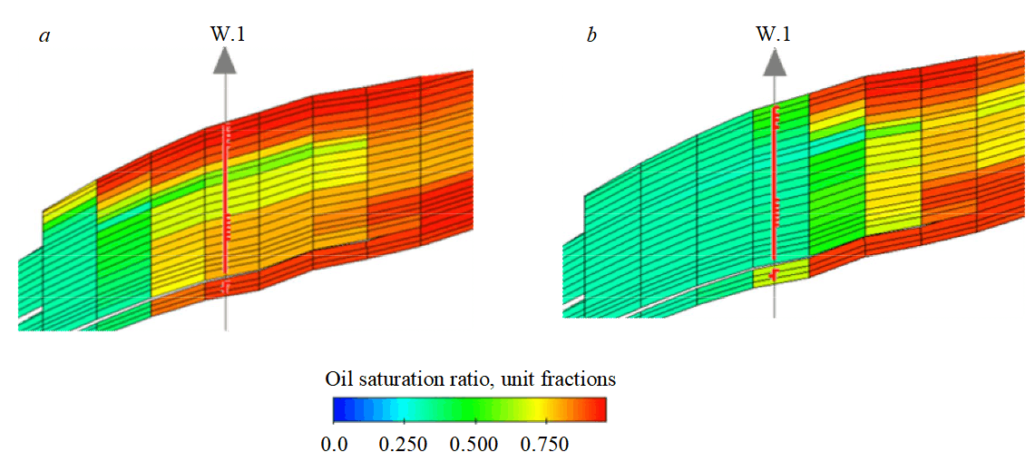 Fig.6. Well 1 section, illustrated by the 3D volume of oil saturation before (a) and after (b) OSHSP implementation