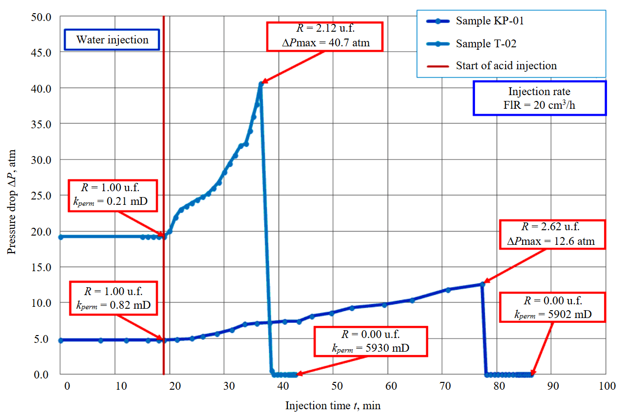 Fig.1. Pressure change characteristics during injection of technological acid solution into water-saturated core samples KP-01 and T-02