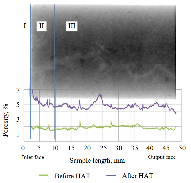 The graph in Fig.2 illustrates the changes in porosity along the entire length of the KP-01 sample and the X-ray tomography of the extended dissolution channel formed. During the acid treatment process, constant contact between the carbonate material and the acid solution was observed at the inlet end, leading to the formation of a complete dissolution segment – zone I. Further within the sample volume, zone II was formed, characterized by changes in the primary structure of the pore space due to the creation of new cavities and short channels, with a depth of 7 mm in the sample.