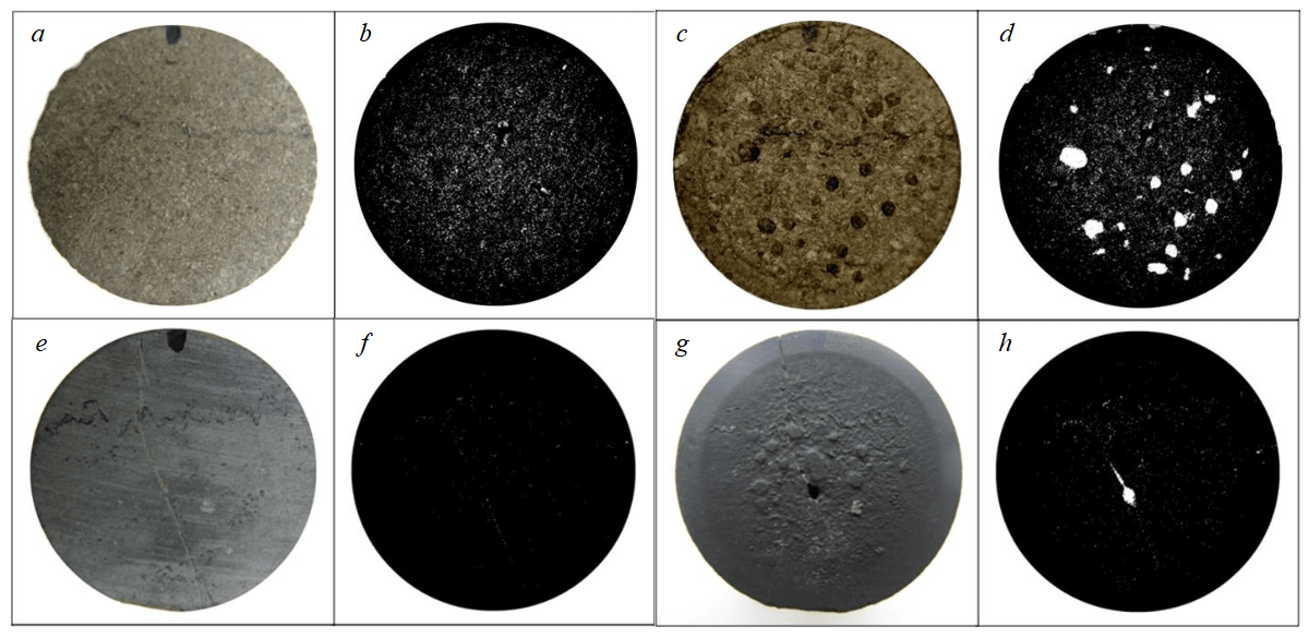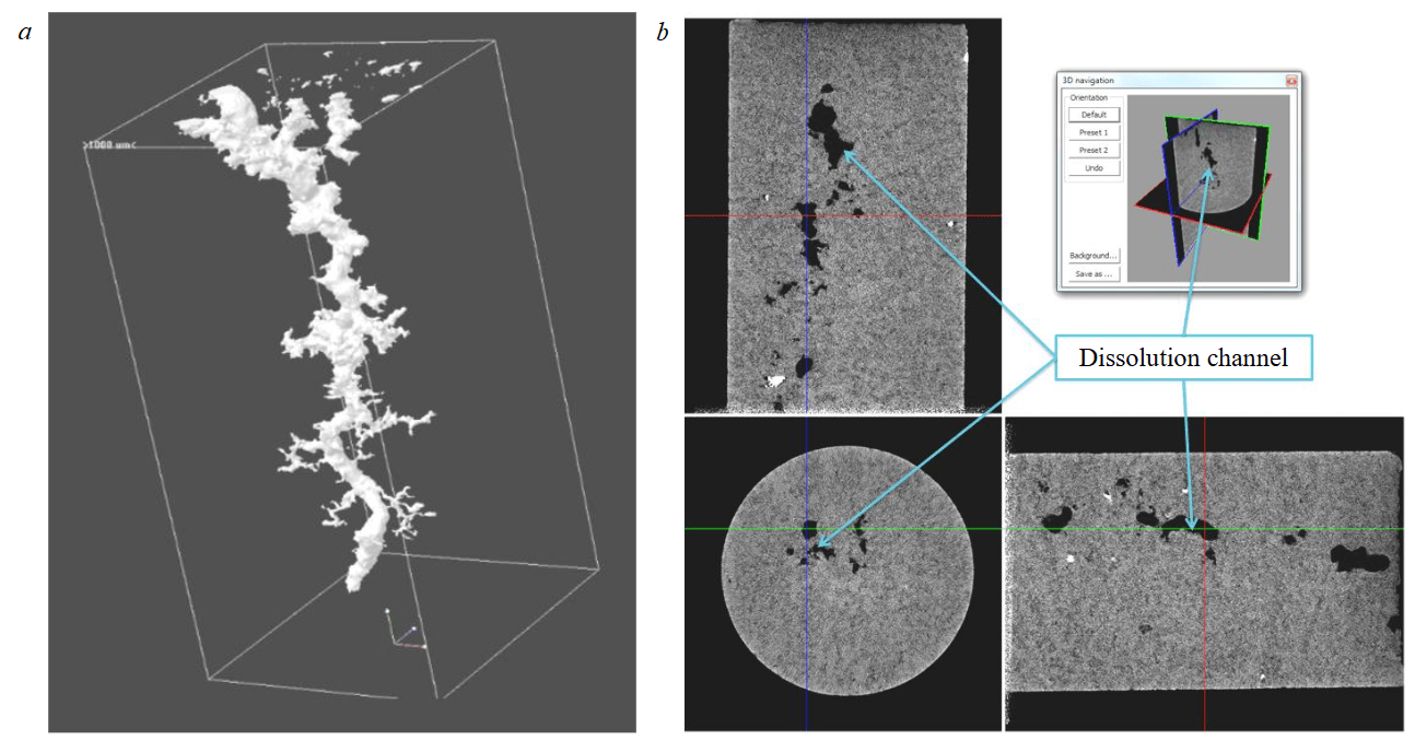 The research on these samples was conducted in several stages. The first stage involved studying the structure of the pore space using X-ray computed tomography (CT) and determining the core's filtration characteristics before acid treatment. The second stage involved the injection of hydrochloric acid solution through the core samples. The final stage included re-scanning and laboratory studies of the core after hydrochloric acid treatment.