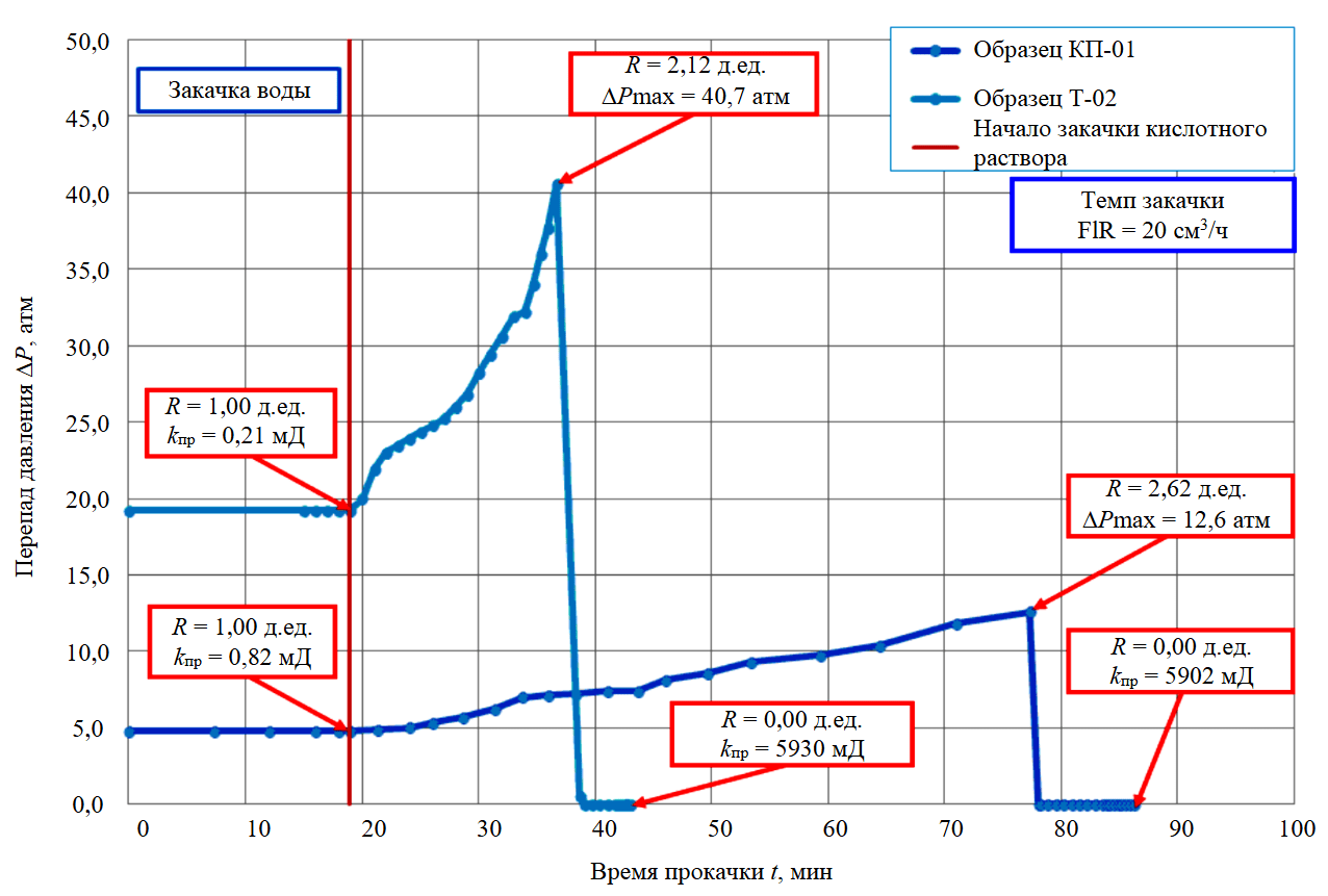 На втором этапе вместо пластовой воды производилась прокачка технологического солянокислотного раствора. Темп закачки кислоты (FlR – flow rate, постоянный расход/темп закачки) на протяжении всего эксперимента оставался одинаковым – 20 см3/ч. Как видно из графика изменения давления в процессе эксперимента (рис.1), время прорыва соляно-кислотного раствора через образец с резким падением фильтрационного сопротивления R и соответственно ростом проницаемости для порово-кавернового коллектора составило 66 мин, а для трещинного гораздо меньше – 17 мин. Конечные значения проницаемости kпр 5902 и 5930 мД.