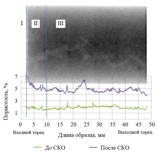 На рис.2 приведено изменение пористости по всей длине образца КП-01 и рентгенограмма образовавшегося протяженного канала растворения. В процессе СКО на входном торце наблюдался постоянный контакт карбонатного материала с кислотным раствором и растворением первого, что привело к образованию сегмента полного растворения – зона I. Далее в объеме образца была сформирована зона II изменения первичной структуры фильтрационно-емкостного пространства за счет образования новых каверн и коротких каналов, глубина которых в образце составила 7 мм.