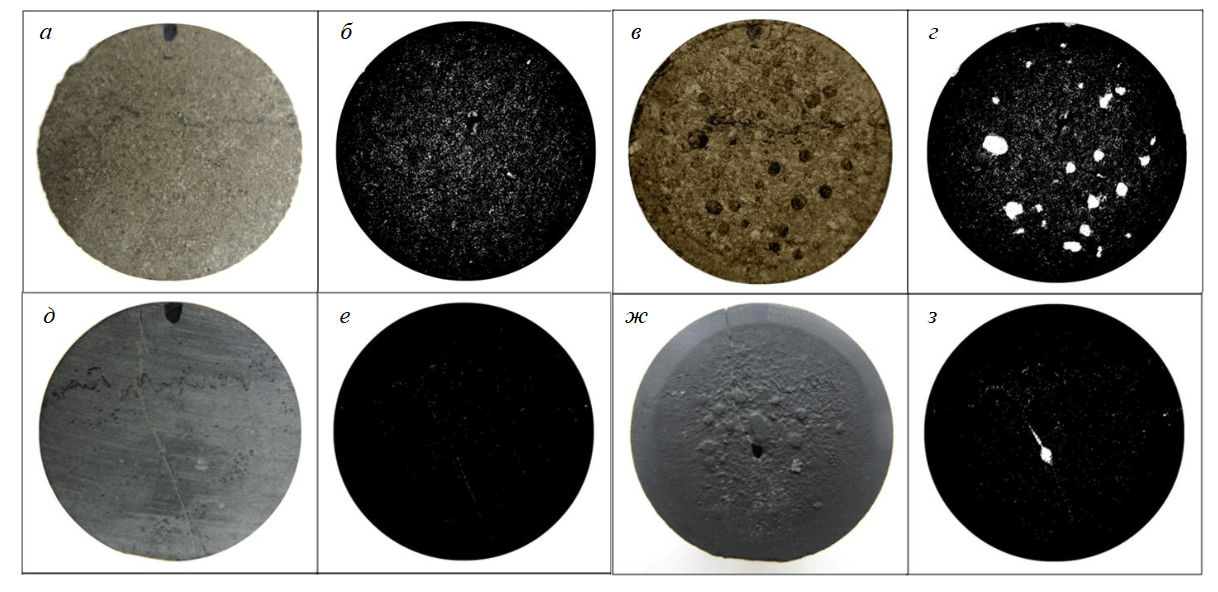 а, б – Nп = 10593 шт., Sп = 62,4 мм2/мм3, Kп = 1,00 %, Pпл = 233 шт./мм3, dп : min 13,9 мкм, max 249,9 мкм; в, г – Nп = 17231 шт., Sп = 225,53 мм2/мм3, Kп = 6,53 %, Pпл = 379 шт./мм3, dп : min 13,9 мкм, max 861,7 мкм; д, е – Nп = 761 шт., Sп = 2,86 мм2/мм3, Kп = 0,04 %, Pпл = 18 шт./мм3, dп : min 13,9 мкм, max 129,0 мкм; ж, з – Nп = 2828 шт., Sп = 17,40 мм2/мм3, Kп = 0,45 %, Pпл = 65 шт./мм3, dп : min 13,9 мкм, max 566,9 мкм