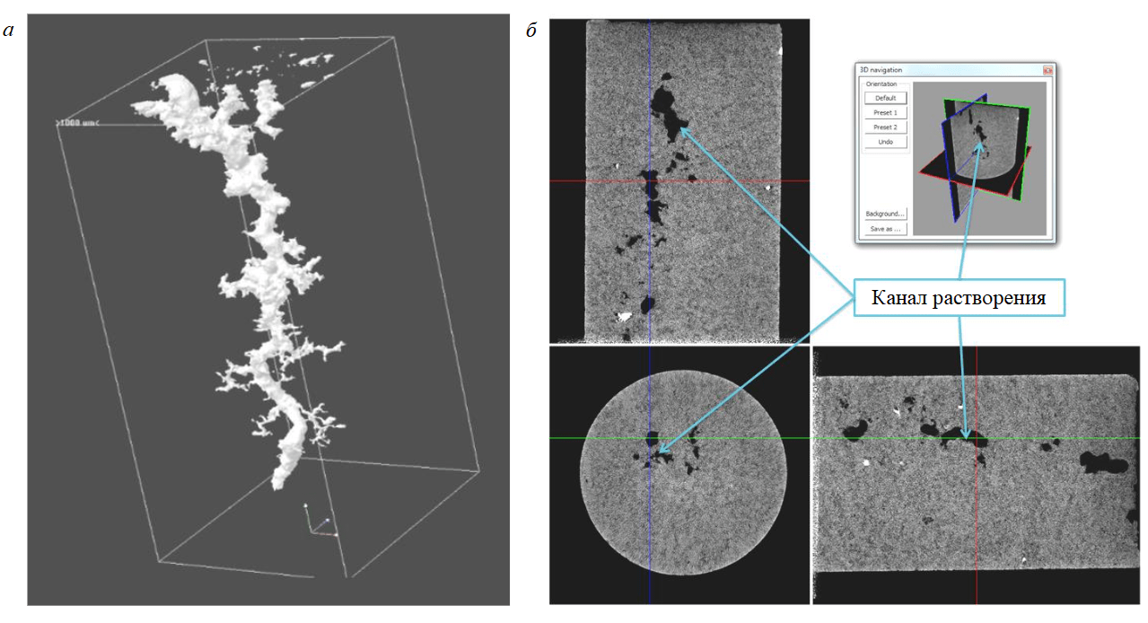 Рис.6. Внутренний объем каналов растворения: а – система 3D и его вид на томографических срезах; б – система 2D