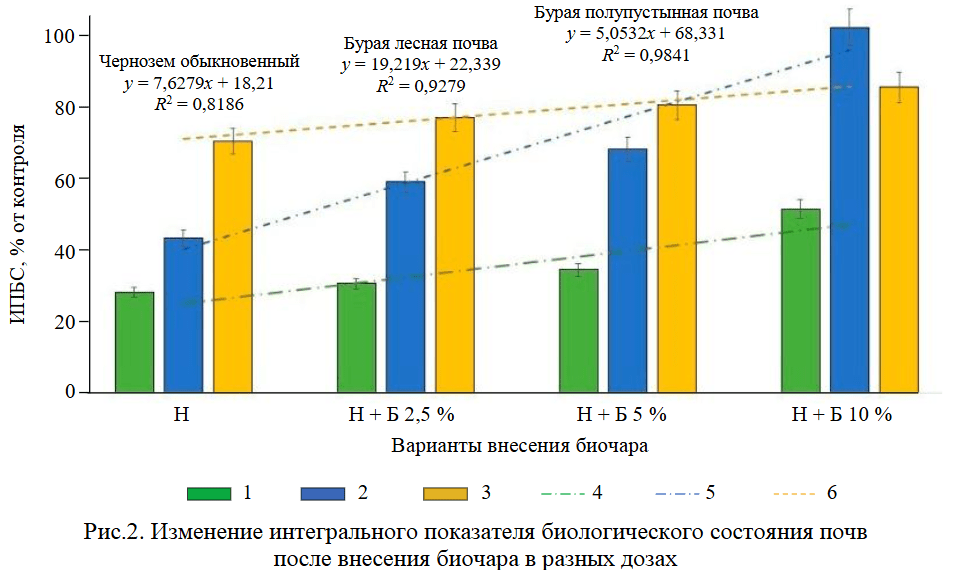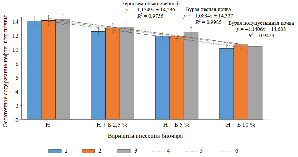 Согласно уравнениям регрессии и коэффициентам детерминации, наиболее тесная связь между разложением нефти и воздействием биочара в разных дозах соответствует бурой лесной почве (R2 = 0,9985), наименее – бурой полупустынной (R2 = 0,9423), а чернозем обыкновенный соответствует промежуточному значению (R2 = 0,9735). Разница в разложении нефти в почвах связана с гранулометрическим составом, содержанием органического вещества и реакцией почвенной среды [32]. В тяжелосуглинистых почвах, как бурая лесная и чернозем обыкновенный, внесение биочара снижает содержание нефти в большей степени, чем в бурой полупустынной, имеющей супесчаный гранулометрический состав. Таким образом, ряд эффективности биочара для разложения нефти в почвах имеет вид: бурая лесная почва > чернозем обыкновенный > бурая полупустынная почва.