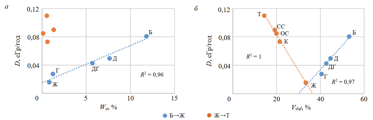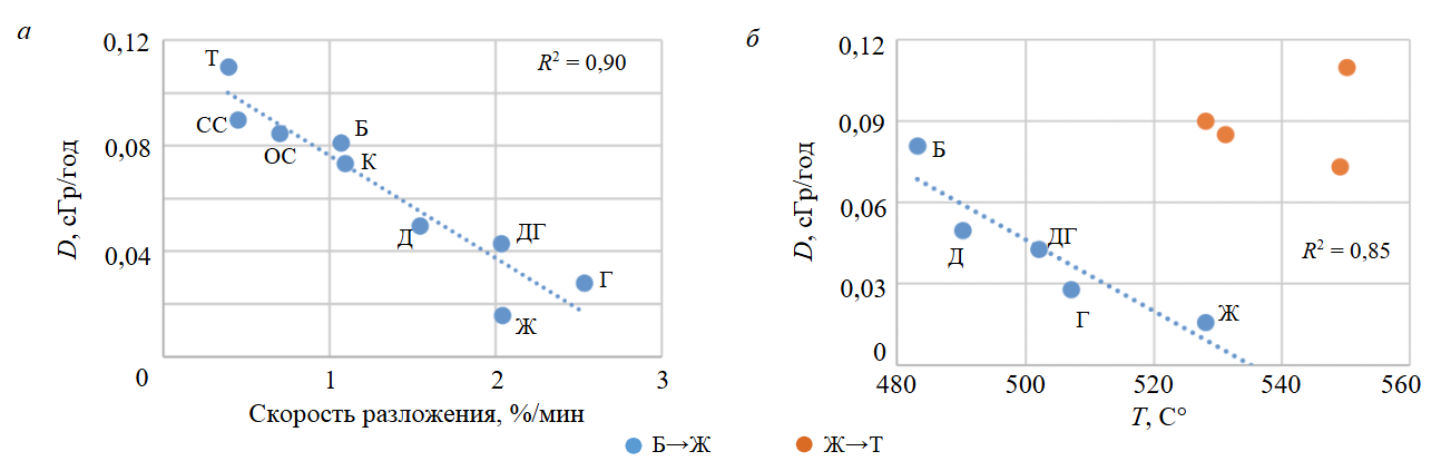 Рис.4. Корреляционные зависимости поглощенных доз и степеней метаморфизма от скоростей разложения углей (а) и температур максимального выделения H2O в инертной среде (б)