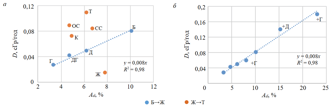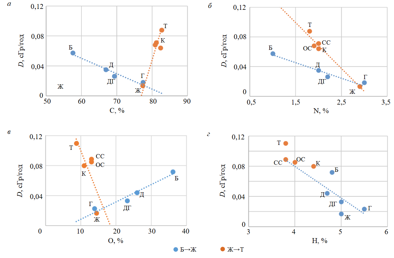 Приведенные на рис.1, 3, 5 зависимости поглощенной дозы от выхода летучих, концентраций углерода, кислорода, азота и структурных фрагментов углерода демонстрируют резкое изменение поглощенных доз при переходе от углей марки Ж к маркам более высоких степеней метаморфизма. Все зависимости претерпевают резкое изменение хода с тенденцией к росту поглощенных доз в ряду метаморфизма К→T в противовес тому, что наблюдается при низких степенях метаморфизма. Резкое изменение хода зависимостей можно объяснить только привлекая гипотезу о существенном изменении условий формирования или преобразования массивов (температур, глубин, давления, газовой среды, минерализации, окислительно-восстановительных условий) [26-29]. Смена условий накопления в углях радионуклидов происходит при прохождении стадий метаморфизма Г→Ж→К и, вероятно, связана с глобальными процессами во временной период их формирования при более интенсивном поступлении радионуклидов в объекты биосферы при формировании высокометаморфизованных углей.