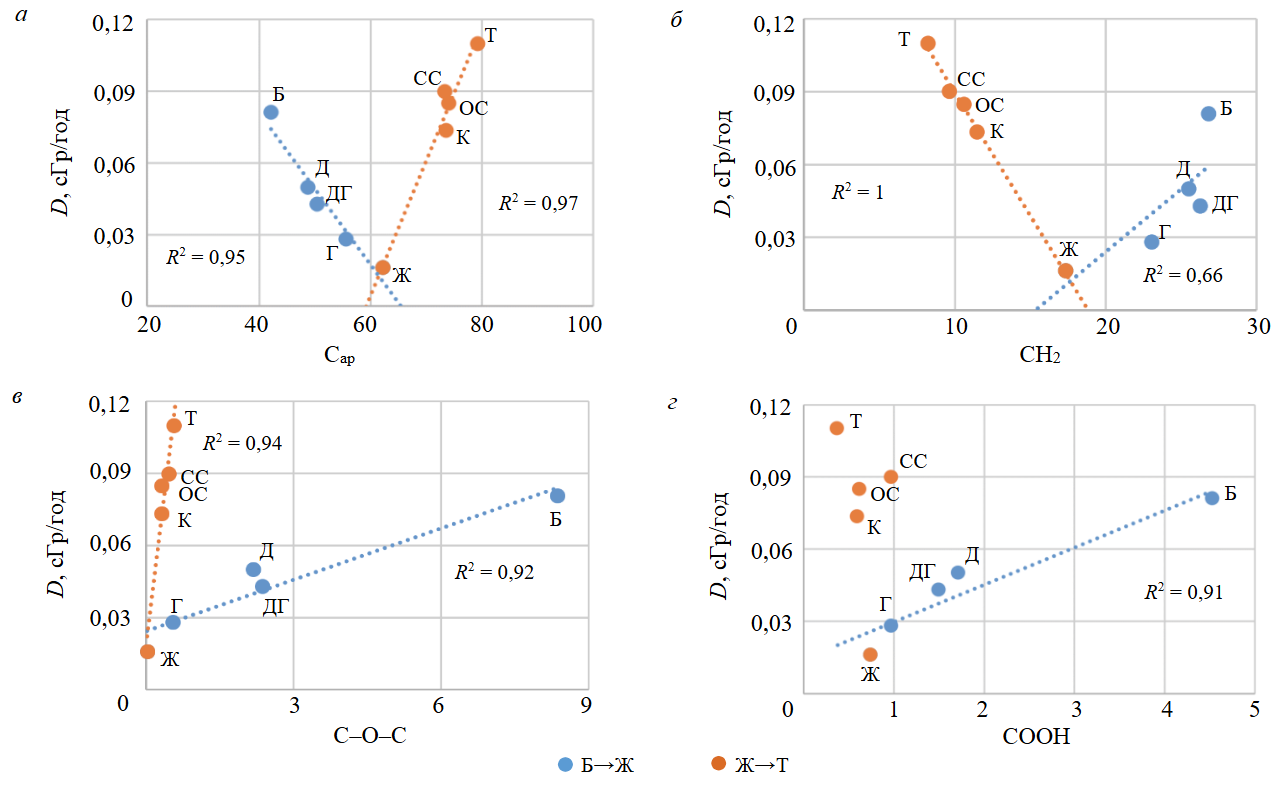 Распределение углерода по структурным фрагментам – карбонильным (С=O); карбоксильным (COOH); ароматическим атомам углерода (Сар); ароматическим атомам углерода, связанным с атомами кислорода (Сар–О); протонированным ароматическим атомам углерода (Сар–H); метоксильным фрагментам (OСH3); атомам углерода алкильных фрагментов (СH2) – выполненное методом моделирования по результатам ЯМР-исследований в инертной среде, показывает разноплановое поведение фрагментов от поглощенных доз (степеней метаморфизма проб) (рис.5). С ростом степени метаморфизма и падением поглощенных доз в ряду Б→Ж наблюдается рост содержания Сар, а также фрагментов СH3 и OCH3 и падение количества Сар–H, Сар–О, фрагментов СН2, С–О–С, COOH и С=O. Корреляционные зависимости Сар, СН2, С–О–С и СООН от поглощенной дозы для всего исследованного ряда метаморфизма приведены на рис.5.