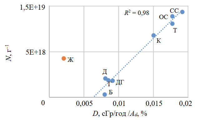 Из логичной зависимости выпадает проба угля Ж, которая при минимальной поглощенной дозе и среднем возрасте обладает высоким числом парамагнитных центров. Можно предположить, что за их создание, кроме рассматриваемого радиационного фактора, ответственны более сложные специфические условия формирования дефектов (температура, давление и др.).