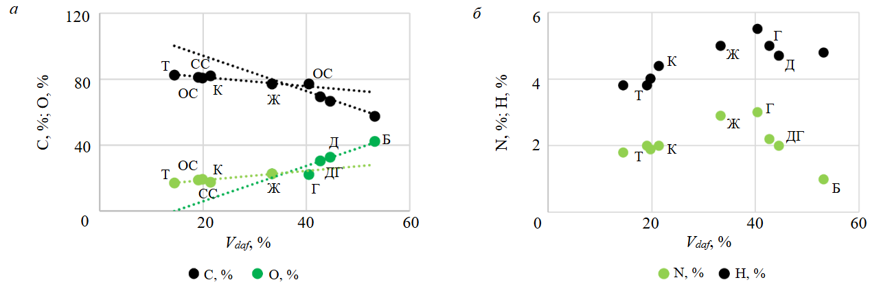 Рис.7. Зависимость концентраций основных органических элементов угля от содержания летучих веществ в углях разных стадий метаморфизма: а – углерода, кислорода; б – азота, водорода