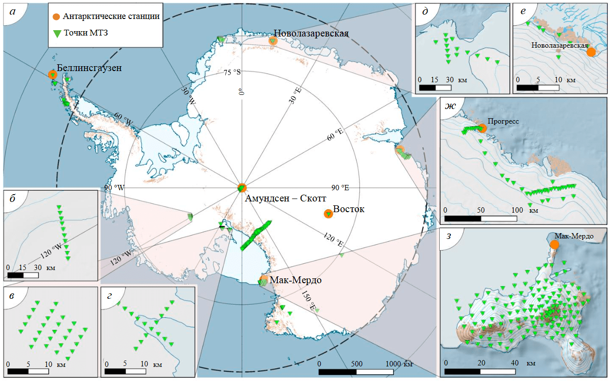 Рис.1. Районы работ методом МТЗ в Антарктиде: а – расположение точек магнитотеллурического зондирования на карте Антарктиды; б – район подледникового бассейна Берда; в – район подледникового озера Уилланс; г – район предполагаемой зоны выхода в океан водотока из подледникового озера Уилланс; д – район станции Ноймайер III; е – район станции Майтри (оазис Ширмахера); ж – район холмов Вестфолд; з – район о-ва Росса
