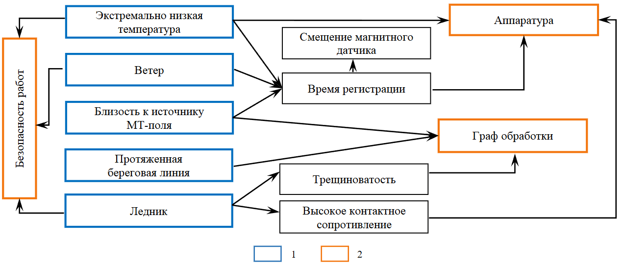 Выделен ряд факторов, которые усложняют получение качественных МТ-данных: экстремально низкая температура, сильный ветер, близость к источнику, протяженная береговая линия, покрытие ледником большей части территории.