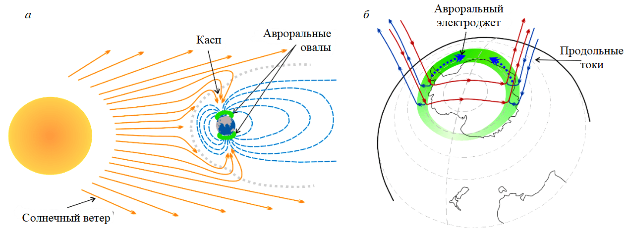 Рис.5. Схематическое изображение магнитного поля Земли (а) и продольных токов в авроральной зоне (б)