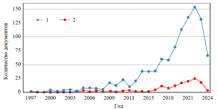 Рис.1. Библиографический анализ трендов в исследованиях по ключевым словам «кустарная мелкомасштабная добыча золота» (1) и «кустарная мелкомасштабная добыча золота в Индонезии» (2) [14]. Дата проведения – 26 июня 2024