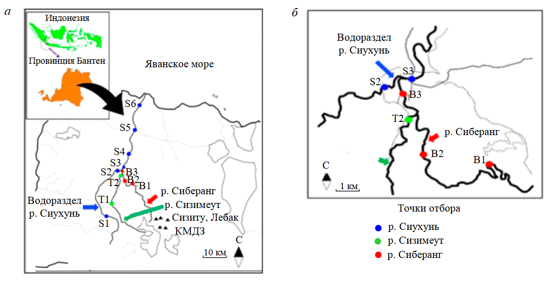 Исследование выполнено в водоразделе р. Сиухунь провинции Бантен, Индонезия. Зона отбора проб располагается в следующих координатах: 6°1'28.423''E – 6°34' 3.031"E и 106°10' 9.354"S – 106° 9'53.67"S (рис.2, а). На рис.2, б карта увеличена. В 2019 г. Агентство окружающей среды и лесного хозяйства провинции Бантен опубликовало данные о том, что р. Сиухунь обладает двумя большими притоками: р. Сизимеут (458 км2) и р. Сиберанг (305 км2). Вода из этих двух рек используется для санитарных мероприятий и в сельским хозяйстве, поэтому данные исследования приобретают особую важность.