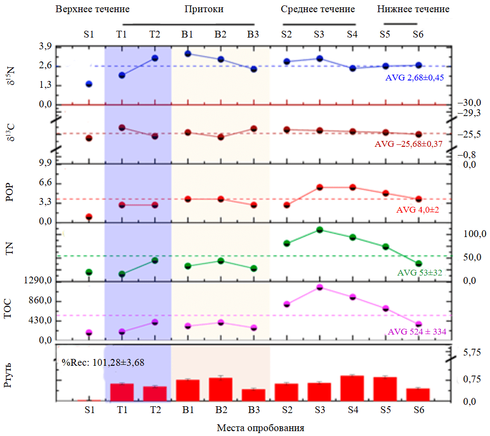 Речные отложения различаются по геохимическим параметрам, например по органике, распределению частиц, кислотности, минералогии, – всему, что влияет на мобильность и биодоступность ртути [12]. В данном исследовании осадочное органическое вещество (ОВ) и изотопы (δ13C, δ15N) использованы в качестве маркера загрязнения окружающей среды, идентифицирующего источник ртути в речных отложениях. Ртуть сильно коррелирует с органическим веществом, что влияет на ее распределение по взвешенным веществам в толще воды и секвестрацию в отложениях [12]. Таким образом, источник ртути может быть представлен на основе осадочного ОВ. Стабильные изотопы в ОВ озерных отложений часто используются для отслеживания источников органики ввиду слабой подверженности изотопного состава осадочного органического вещества влиянию постфотосинтетических и диагенетических процессов [13]. С помощью модели изотопного смешивания можно определить источник ртути в смеси.