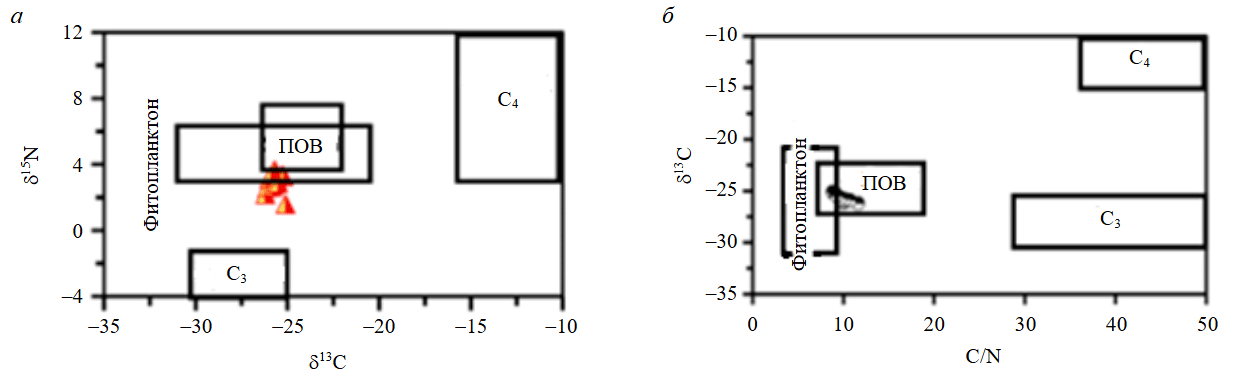 Данное исследование выполнено во время влажного сезона, т.е. течение реки было сильным, и ожидалось, что распределение частиц ОВ будет значительно зависеть от течения. Поэтому сделано предположение, что во время влажного сезона ОВ из верхнего течения этих притоков могут быть перенесены в основное течение. Для определения типа ОВ выполнена оценка изотопов δ13C и δ15N (рис.4, а).