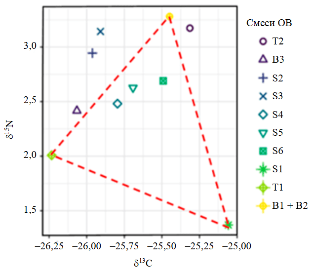 В данном исследовании доля вклада n+1 различных источников может быт определена с помощью разных изотопных трассеров на основе сохранения массы стабильного изотопа. Исходя из графика δ15N и δ13C (рис.5), ОВ, которые накапливаются в отложениях р. Сизимеут (смеси S4, S5 и S6), имели сходные характеристики с ОВ, которые были получены из смеси T2 и B3; эти точки находились относительно близко к источнику (T1, B1 + B2). В случае с точками S3 и B2, которые выходят за пределы треугольника, использован пакет «siar», основанный на симуляции полигонов смешивания Монте-Карло, чтобы применить предположение «точка в полигоне» к этим моделям [22].
