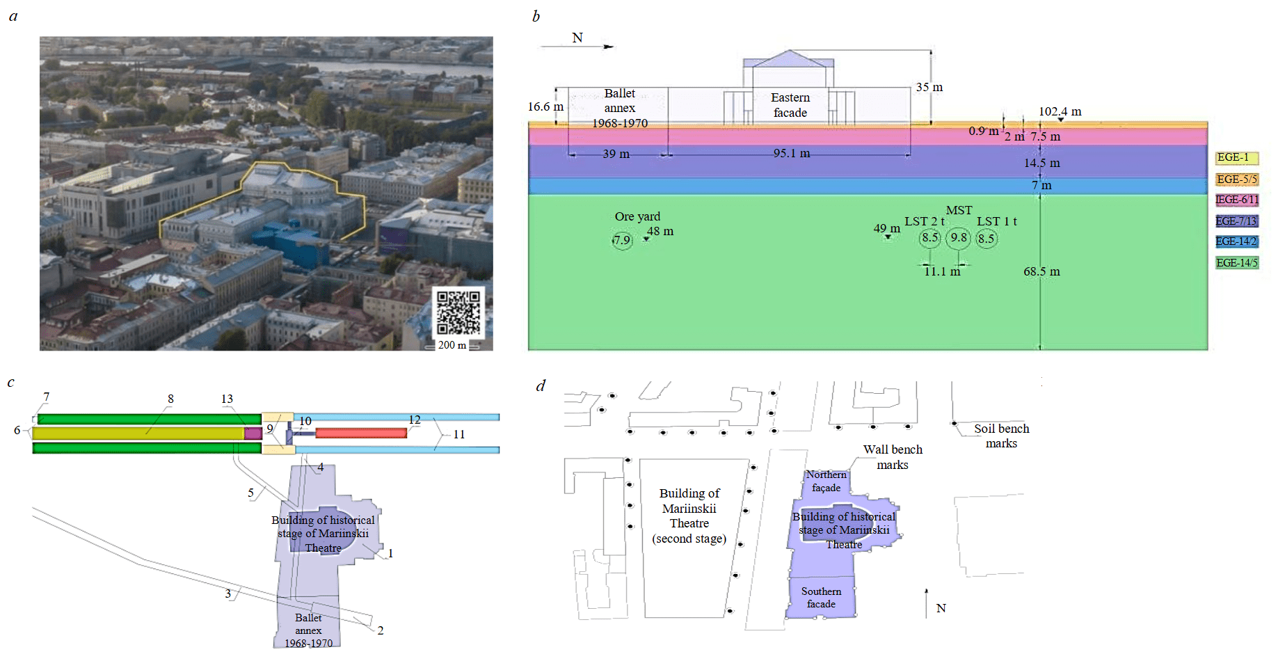 Fig.1. Construction site of Teatralnaya station complex: a – view of the New Stage and historical building of Mariinskii Theatre (Yandex Maps); b – geological structure of Teatralnaya metro station construction area; c – location of workings relative to historic stage building of Mariinskii Theatre; d – layout of observation station near the Theatre