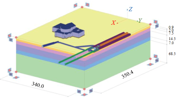The model allowed considering the stagewise scheme of driving the workings in the underground complex and the impact on the undermined objects. The general quantitative reliability of shifts and deformations on the surface was ensured by verification based on real data on subsidence in the construction area and calibration of numerical models through the surface contraction parameter of the conditional loss of volume when driving the workings. Detailing the mechanisms of changing the SSS (stress-strain state) of rocks during cyclic erector driving of station tunnels was not considered (in accordance with the Saint-Venant principle) due to a large distance from the working faces to the building foundation.