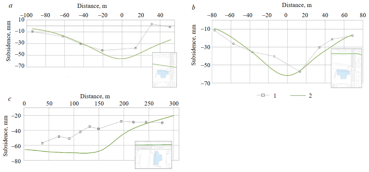 1 – subsidence according to field observations; 2 – subsidence obtained in the model