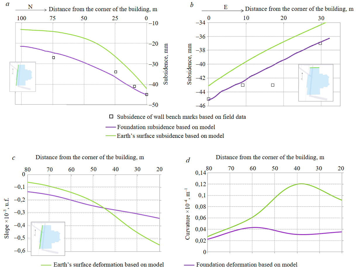 Fig.4. Distribution of shifts (a, b) and deformations (c, d) of the earth's surface and foundation of the Theatre: a – subsidence along the western facade of the building; b – subsidence along the northern facade of the building; c – deformations of slopes; d – deformation of curvature along the western facade of the building