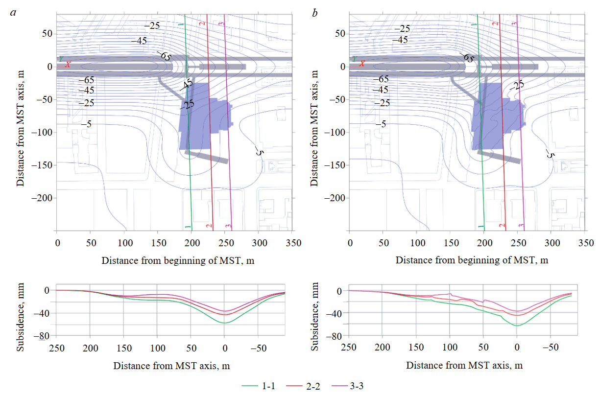 The evaluation of the tunnel – rock mass – building system operation using numerical simulation was carried out through a comparative analysis of deformations and shifts of the earth's surface with and without a building in the model; the calculations were considered at the stage of completion of the construction of the underground complex of workings.