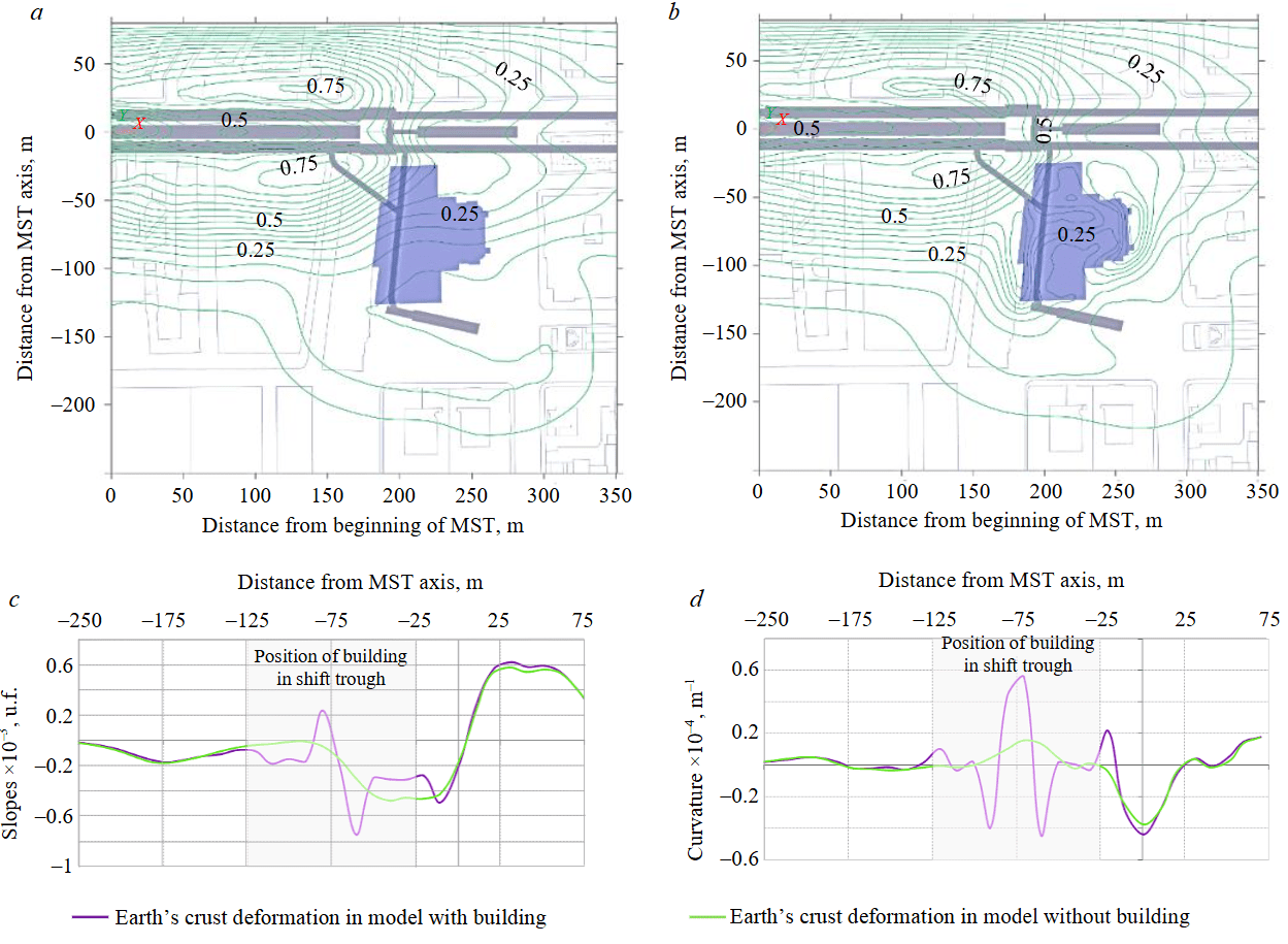 Analysis of the distribution of deformations of the earth's surface slopes is presented in Fig.6, a – without considering the influence of the building; Fig.6, b – considering the influence of the building. Due to a marked change in intensity of subsidence development along the contour of the building, the slopes (uneven subsidence) and the curvature of the earth's surface increase in this place, which can negatively affect the condition of underground communications and other structures in these areas (Fig.6, c, d). A tendency of slope reduction in the northern and southern wings directly under the building is clearly visible, this is due to the influence of spatial rigidity of the building. At the same time, in the audience space of the building, on the contrary, increased values of slopes are recorded.
