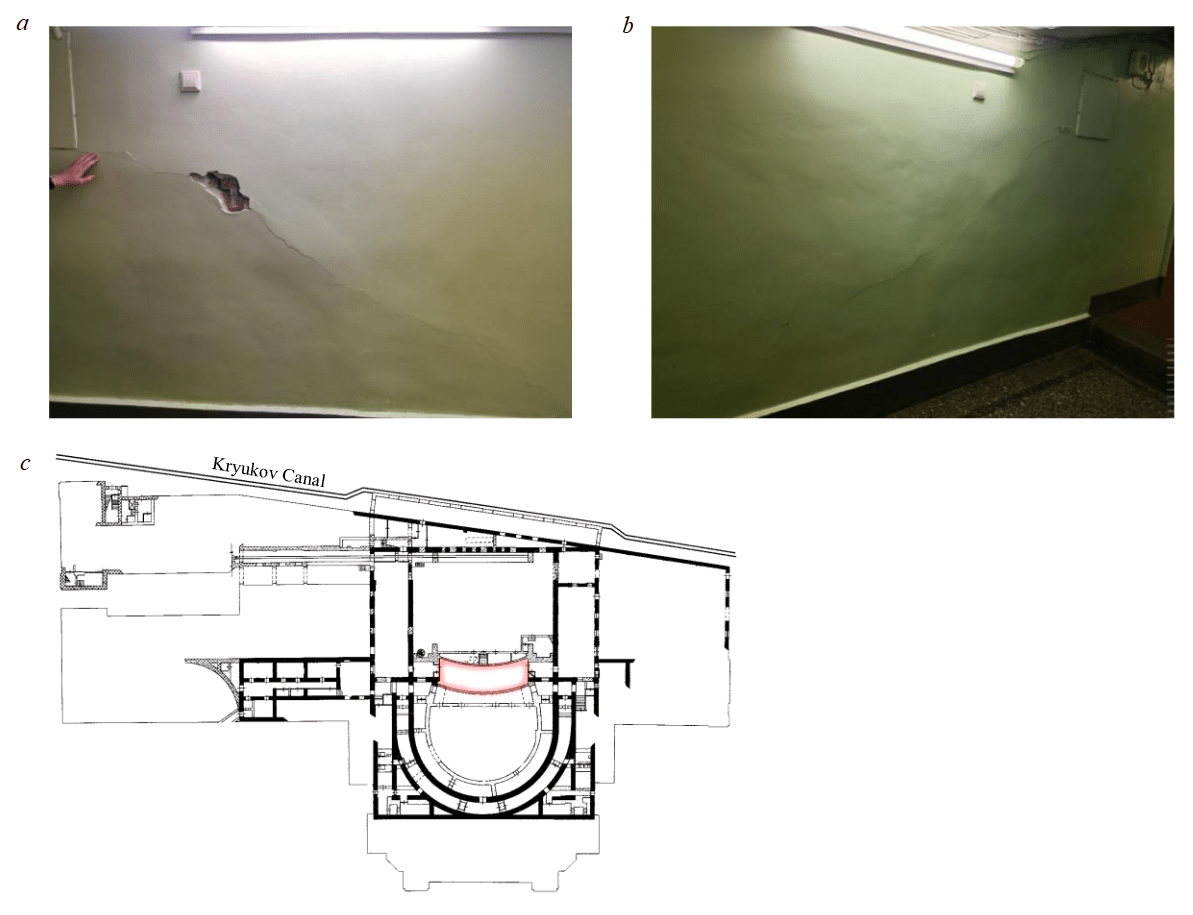 Fig.7. Condition of walls of the orchestra pit in Mariinskii Theatre (a, b); area of damage under consideration and the plan of basement premises (c) of Mariinskii Theatre