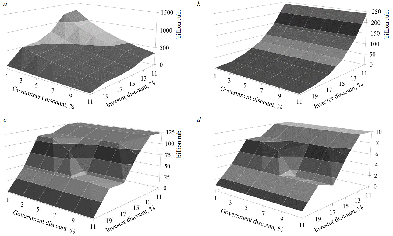 This circumstance determines the focus of attention in the numerical experiment, i.e., on analy-zing the dependence of the efficiency of the Stackelberg equilibrium program on the parameters DG and DI. The former parameter reflects the quality of investment climate from the point of view of the investor. In the calculations, a favorable investment climate corresponds to DI = 0.11 (the expert assessment for today’s Transbaikalia is DI = 0.15-0.17). The government discount reflects the level of liberality of the government’s investment policy. Operating with a discount of 0.01, a liberal government understands that on the long-term horizon, the most important role belongs to multiplier effects, which exceed the direct return from budget investments into the infrastructure projects (including compensation payments) in the form of subsoil users’ tax payments. A conservative government runs its investment policy with a tangibly larger discount, which reflects its aspirations to materialize the expectations of the subsoil owner [52].