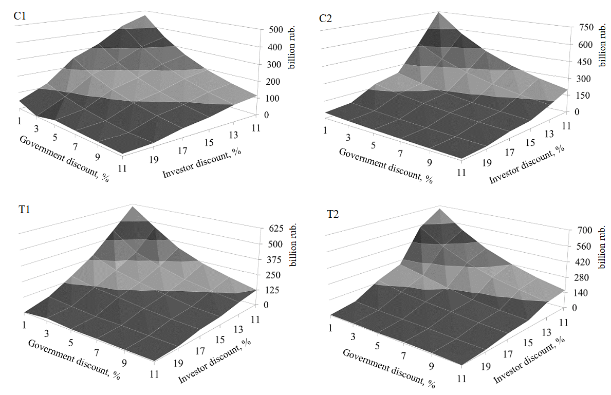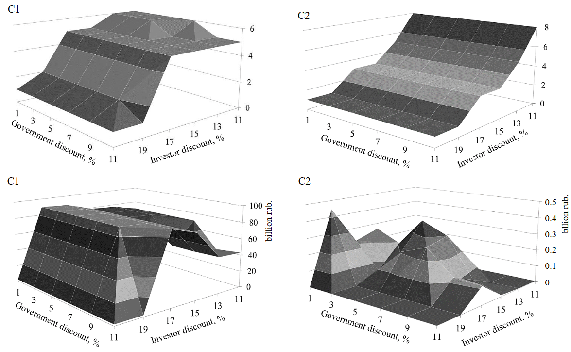 Thus, faced with today’s severe budget deficit, the government has a clear goal to implement the classical PPP model in the C2 modification. The methodological foundation of this scheme lies with an integral assessment of the investor’s NPV in the implemented subsoil development program. This approach requires a higher level of trust in the partnership and the presence of institutions for monitoring the investor’s effects.