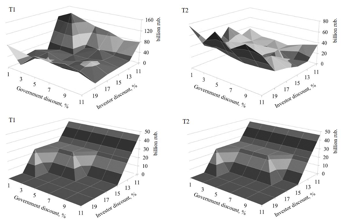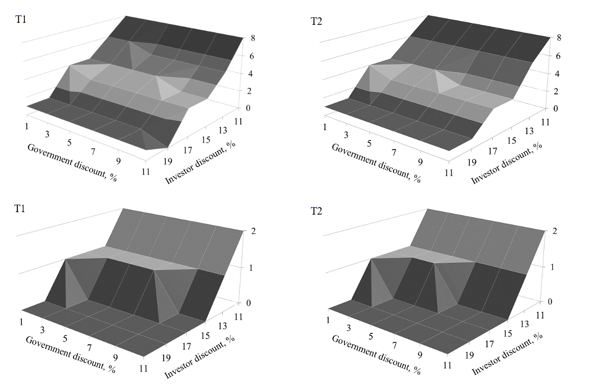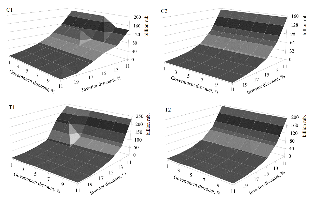 An alternative principle of mutual settlements is realized in the models C2 and T2. It is based on assessing the investor’s overall effect obtained in the process of developing the deposits, building the necessary infrastructure facilities, and receiving compensations from the government, which ensures a positive NPV of program (7) implemented by the investor. Such a scheme assumes a higher level of trust in the partnership and the presence of institutions for monitoring the investor’s effect. Formally, such a partnership scheme is described by the same bilevel problem but without constraint (8): {(1)-(7), (9)-(15)}.