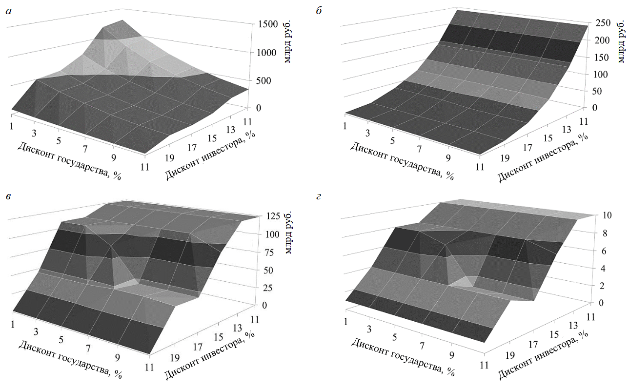 Это обстоятельство определяет фокус внимания численного эксперимента – анализ зависимости эффективности равновесной по Штакельбергу программы от параметров DG и DI. Первый из этих параметров отражает качество инвестиционного климата с точки зрения инвестора. Благоприятным условиям инвестирования в расчетах соответствует DI = 0,11 (экспертная оценка для сегодняшнего Забайкалья DI = 0,15-0,17). Дисконт государства отражает уровень либеральности государственной инвестиционной политики. Оперируя дисконтом уровня 0,01, либеральное государство понимает, что на длительном горизонте наиболее важны мультипликативные эффекты, превосходящие прямую отдачу в виде налоговых платежей недропользователей от инвестиций бюджета в инфраструктурные проекты (включая компенсационные платежи). Консервативная инвестиционная политика государства оперирует существенно большим дисконтом, отражающим устремления правительства реализовать ожидания собственника недр [52].
