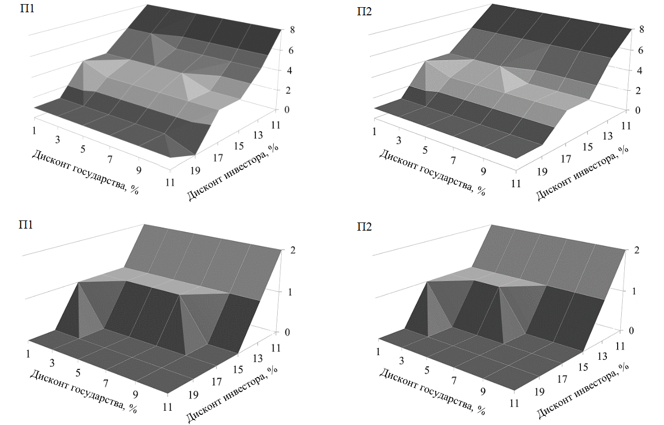 Сформированная информационная база во многом соответствует управленческим технологиям в недропользовании и настроена на инвестиционные процессы с длительным временным горизонтом и нестационарным характером рыночных цен. Это дает возможность учесть особенности моделируемого объекта – процесса формирования программы освоения МСБ на сырьевой территории с недостаточным уровнем развития производственной инфраструктуры. Поскольку такая программа будет строиться на основе равновесия по Штакельбергу, то в первую очередь будет интересно, каким образом меняется решение задач (1)-(15) ({(1)-(7), (9)-(15)}) при вариации основных модельных параметров. Особенно важно это для дисконтов партнеров, рабочие диапазоны которых эксперт может оценить лишь приближенно.