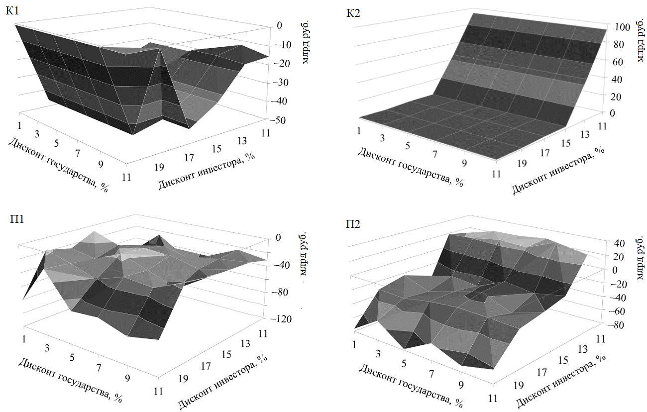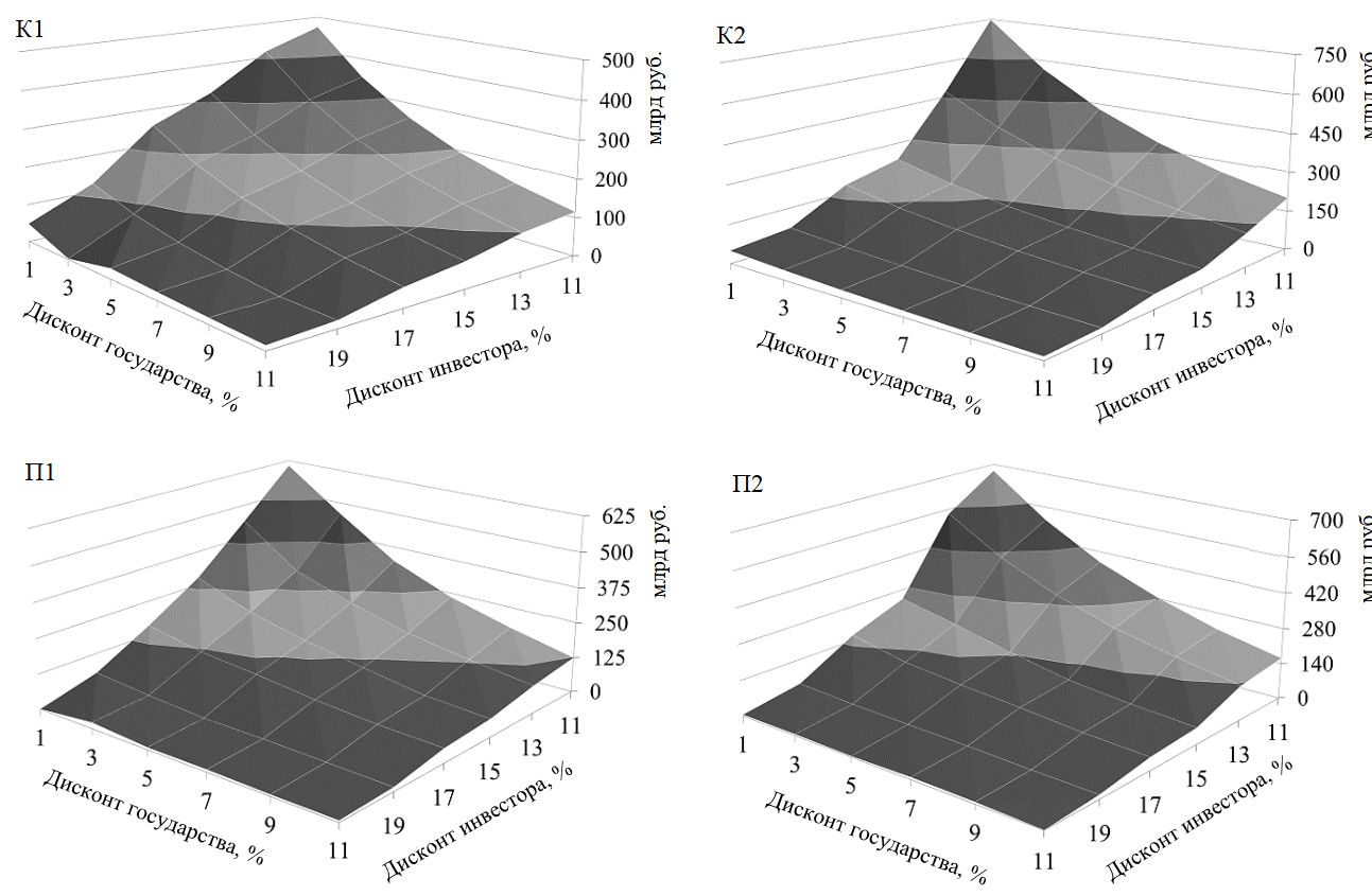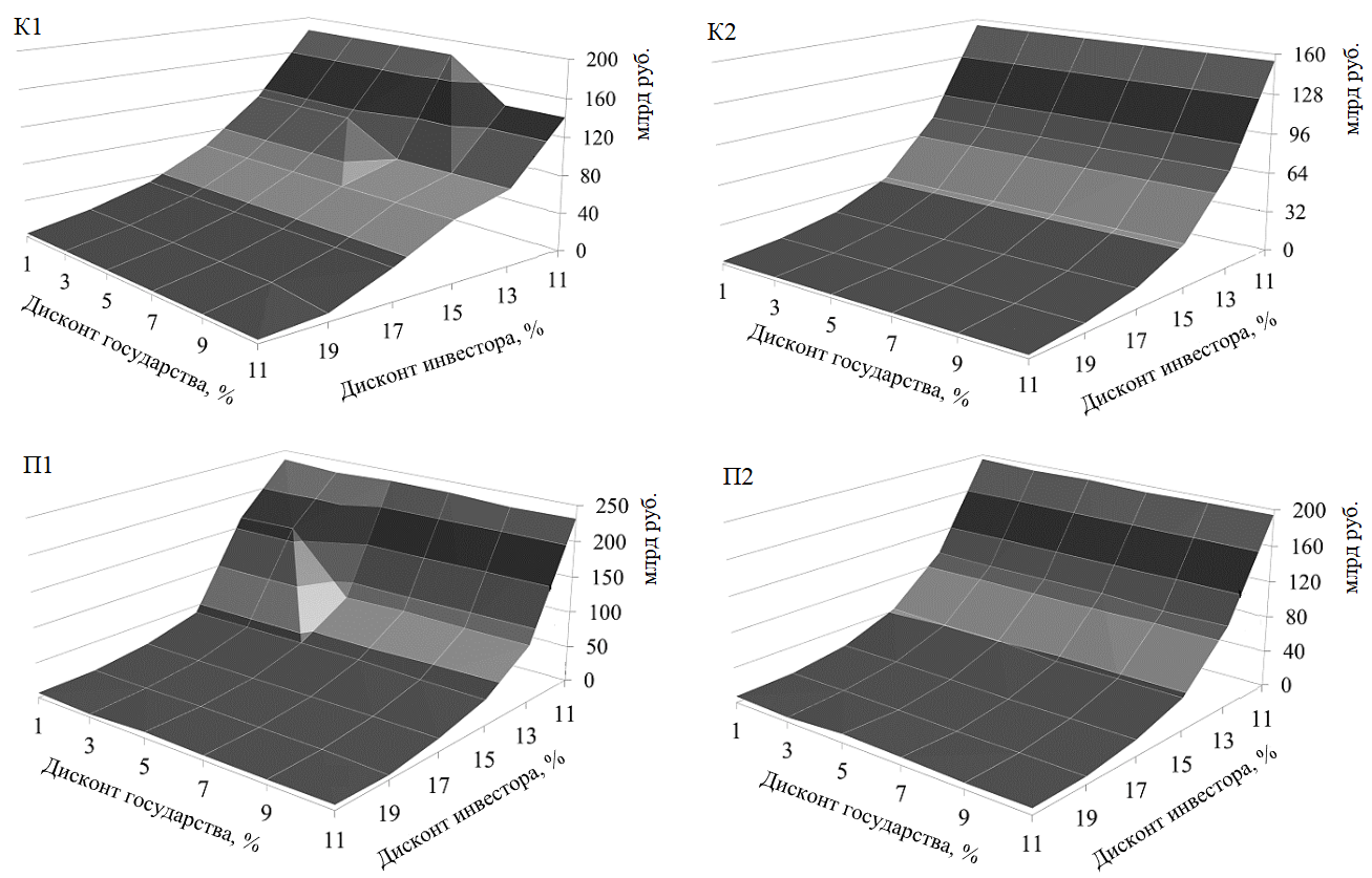 Альтернативный принцип взаиморасчетов реализован в модели К2 и П2. В его основе оценка общего эффекта инвестора, полученного в процессе освоения месторождений, строительства необходимых ему инфраструктурных объектов и получения компенсаций от государства, обеспечивающих положительное NPV реализованной инвестором программы (7). Такая схема предполагает больший уровень доверия в партнерстве и наличие институтов, позволяющих провести мониторинг эффективности инвестора. Формально такой механизм партнерства описывается той же двухуровневой задачей, но без ограничения (8): {(1)-(7), (9)-(15)}.