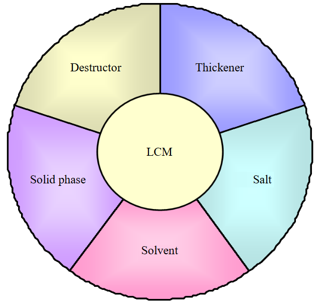 The use of water-based suspension blocking compositions has also been known for a long time. At first, clay solutions were used in this capacity, which, although they had a slight advantage over mineral salt solutions, were not effective enough due to the colmatation of the bottomhole formation zone. In particular, S.Z.Zaripov (1981) showed that killing wells with clay solutions (Bashneft PJSC) in the 1970s led to a significant decrease in well productivity. Research by the service company M-I Swako convincingly showed that it is most expedient to suspend the colmatant particles in thickened solutions of biopolymers. Since biopolymers of microbial origin have a branched structure and fairly high values of the viscoelastic component of complex viscosity, suspended particles do not settle. In addition, in the works [73, 74] the calculation of the optimal fractional composition of colmatating particles depending on the diameter of the pores of the rock is given. Implementation of technologies using absorption control materials (Liquid Control Materials – LCM), or LCM technologies, involves the use of such components as a water-salt base, a water-soluble polymer thickener, a breaker for breaking down the polymer and restoring permeability (Fig.2) [75]. Industrial water is used as a water-salt base, as well as solutions of mineral salts (water-soluble polymers used as thickeners).