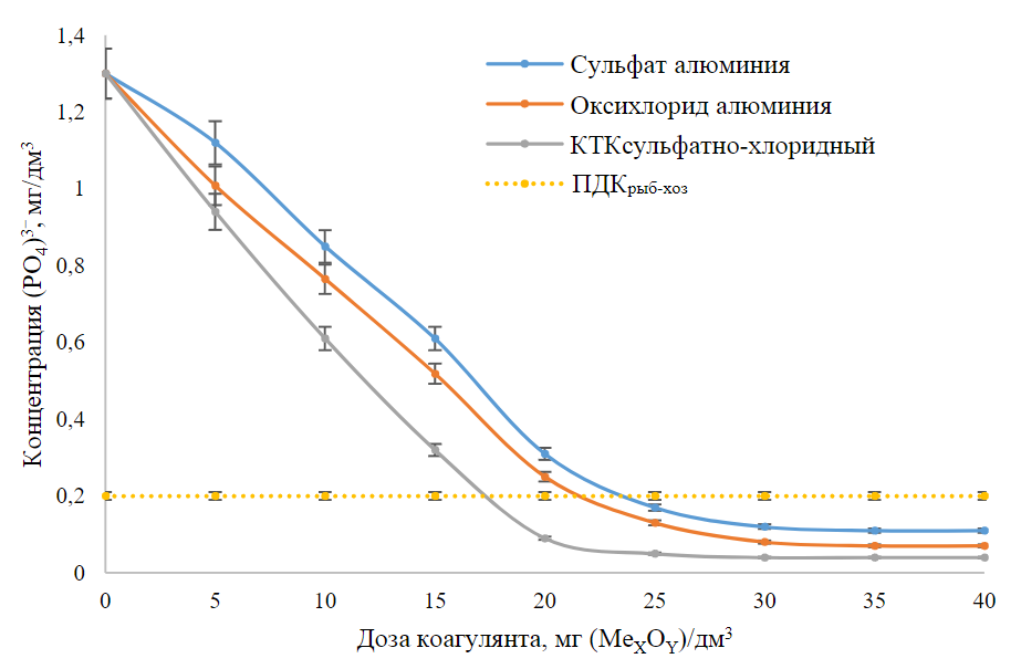 На рис.3 видно, что применение комплексного титансодержащего коагулянта позволяет минимизировать остаточное содержание фосфат-иона, что в первую очередь обусловлено пониженной растворимостью фосфата титана в сравнении с фосфатом алюминия. Помимо повышения эффективности, применение комплексного реагента позволяет также на 10-25 % сократить дозу коагулянта, необходимую для достижения норматива ПДКрыб-хоз.