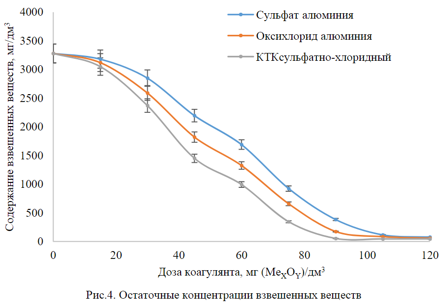 Следующим этапом стала оценка эффективности комплексного коагулянта на образце сточной воды участка приготовления формовочно-стержневой смеси и электродуговой выплавки стали машиностроительного предприятия Московской обл. Исходное содержание взвешенных веществ, представленных оксидами железа, кремния, алюминия и кальция в воде системы мокрой газоочистки, составляло 3280 мг/дм3. Данные по остаточным концентрациям взвешенных веществ в сточной воде в зависимости от типа и дозы применяемого коагулянта представлены на рис.4.