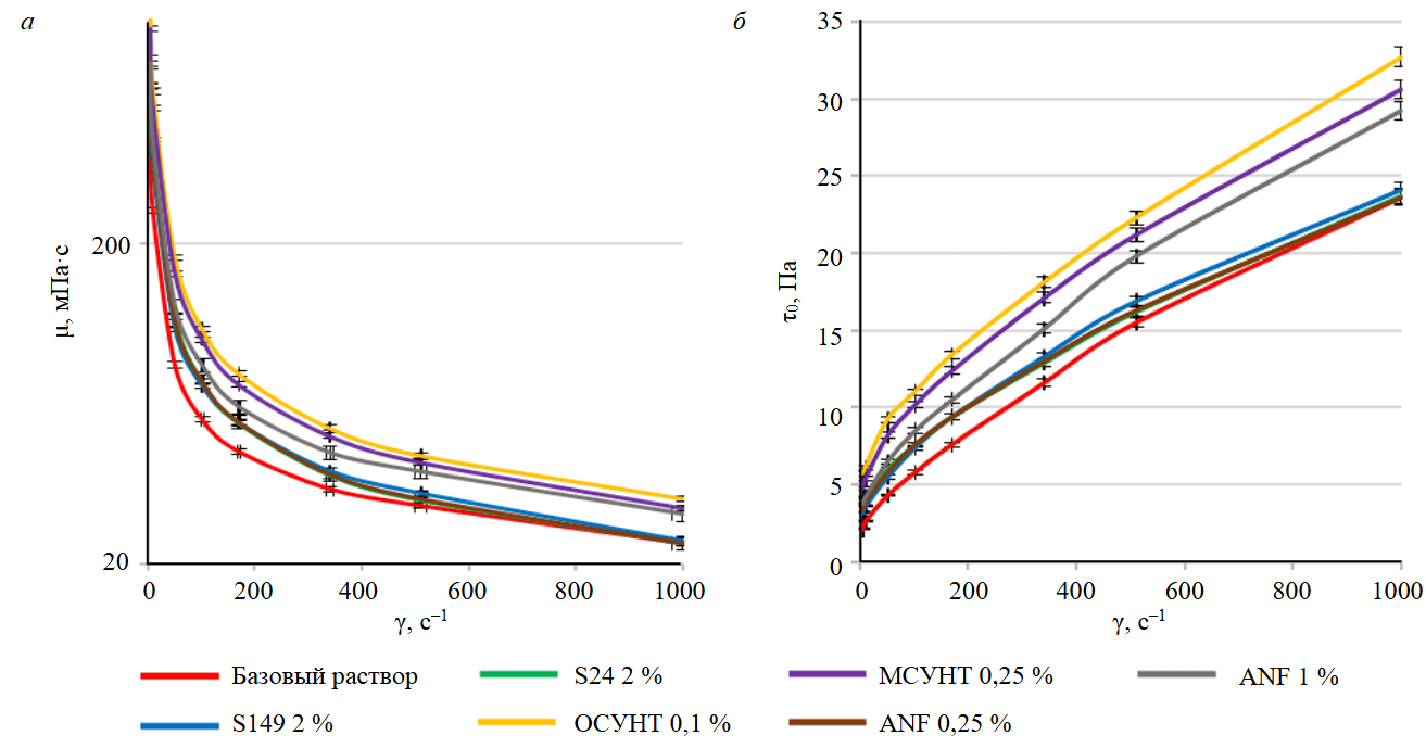 Рис.1. Зависимость вязкости (а) и напряжения сдвига (б) от скорости сдвига для модифицированных буровых растворов S149 2 %, S24 2 % – добавка 2 % по массе наночастиц к базовому раствору со средним размером 5 и 80 нм соответственно; МСУНТ 0,25 % – добавка 0,25 % по массе многостенных углеродных нанотрубок; ОСУНТ 0,1 % – добавка 0,1 % по массе одностенных углеродных нанотрубок; ANF 0,25 % и ANF 1 % – добавка 0,25 и 1 % по массе нановолокон оксида алюминия