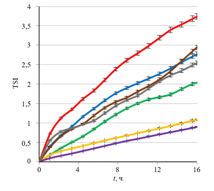 В данной работе изучено влияние нанодобавок на коллоидную устойчивость буровых эмульсий при нормальных условиях. Это исследование выполнено с помощью анализатора Turbiscan LAB. Изучено поведение коэффициента пропускания и обратного рассевания света для образцов буровых эмульсий с нанодобавками. Для количественного анализа скорости этих процессов используется индекс дестабилизации TSI. Этот параметр рассчитывается как интегрированная по высоте образца разность профилей обратного рассеяния света в разные моменты времени. Чем меньше значение индекса TSI, тем устойчивее образец бурового раствора. На рис.2 показано поведение индекса дестабилизации буровой эмульсии с нанодобавками во времени, после этого образец оставили в состоянии покоя. Здесь хорошо видна зависимость стабильности эмульсий от аспектного соотношения наноматериалов, у ОСУНТ оно на порядок больше, чем у МСУНТ. Такая существенная разница в аспектном соотношении вызывает большие различия в степени воздействия нанотрубок на свойства буровых растворов. Например, на рис.2 показано, что с увеличением аспектного соотношения и концентрации нанодобавок индекс TSI монотонно снижается. Это говорит о том, что нанодобавка значительно стабилизирует буровую эмульсию. Также было установлено, что при концентрации добавки сферических 5 нм наночастиц оксида кремния 2 % по массе скорость дестабилизации эмульсии снижается примерно в два раза. Кинетика дестабилизации буровых растворов с одностенными нанотрубками концентрацией 0,1 % по массе, снижает этот показатель уже в 3,5 раза. Анализ данных показал, что базовая модель раствора на углеводородной основе была подобрана хорошо. В сравнении с водными растворами показатель его коллоидной устойчивости находится на достаточно высоком уровне (индекс TSI ≈ 4 против 15 для водных растворов), и добавление наноматериалов дополнительно способствует его стабилизации. Таким образом, было показано, что добавление наноматериалов уменьшает кинетику дестабилизации бурового раствора тем больше, чем выше концентрация нанодобавок и их аспектное соотношение.