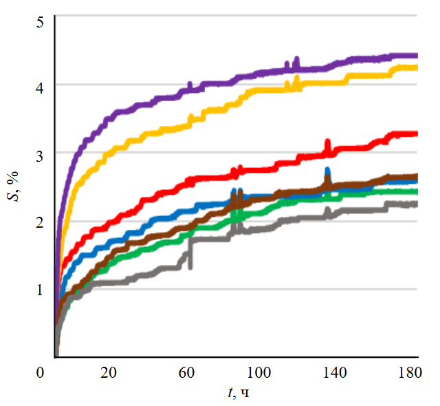 Еще одним важным свойством буровых растворов является их способность сопротивляться набуханию глинистых минералов. Буровой раствор в процессе бурения взаимодействует со стенками скважины, сложенными глинами и другими минералами. В результате водная фаза, находящаяся в растворе, способствует набуханию глины, что приводит к разрыхлению и обрушению стенок скважины. Поэтому буровой раствор должен помогать ингибированию набухания глины. В данной работе впервые выполнено сравнение влияния различных нанодобавок на скорость набухания глинистых цилиндров в буровых растворах на основе дизельного топлива. Кинетика набухания глины была изучена с помощью прибора Ofite 150-80. Для проведения исследований из монтмориллонитовой глины были спрессованы цилиндры размерами 28×12 мм с высокой степенью гидратации, измерялось изменение линейных размеров цилиндров в процессе гидратации глины.