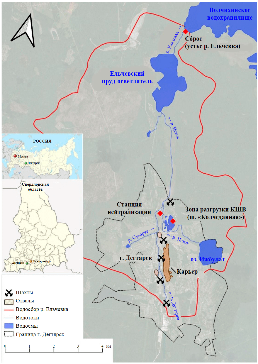 Дегтярское медноколчеданное месторождение расположено на восточном склоне Среднего Урала в муниципальном округе г. Дегтярск Свердловской обл., в 45 км юго-западнее Екатеринбурга, в 18 км юго-восточнее г. Ревда. Месторождение отрабатывалось с 1914 по 1995 годы. Эксплуатация проводилась комплексно как открытым, так и подземным способами до глубины 610 м. В конце 1995 г. в связи с ликвидацией рудника шахтный водоотлив был прекращен и к 1999 г. завершилось заполнение депрессионной воронки [13]. С этого момента КШВ с расходом около 180 м3/ч поступают в провал карьера шахты «Колчеданная» в северной части месторождения. КШВ, вытекающие из карьера, рассредоточенным стоком поступают в р. Исток, где смешиваются с известковым молоком, которое подается по трубопроводу со станции нейтрализации. Затем весь сток нейтрализованных рудничных вод по руслу реки поступает в Ельчевский пруд-отстойник, построенный в 1952 г. для очистки шахтных вод работающего рудника [14-16]. Проектный объем пруда – 9,4 млн м3, площадь 220 га [17]. После отстаивания вода, очищенная от взвеси, по руслу р. Ельчевка попадает в Волчихинское водохранилище, которое является основным источником питьевого водоснабжения Екатеринбурга (население 1,5 млн чел.) (рис.1) [18].