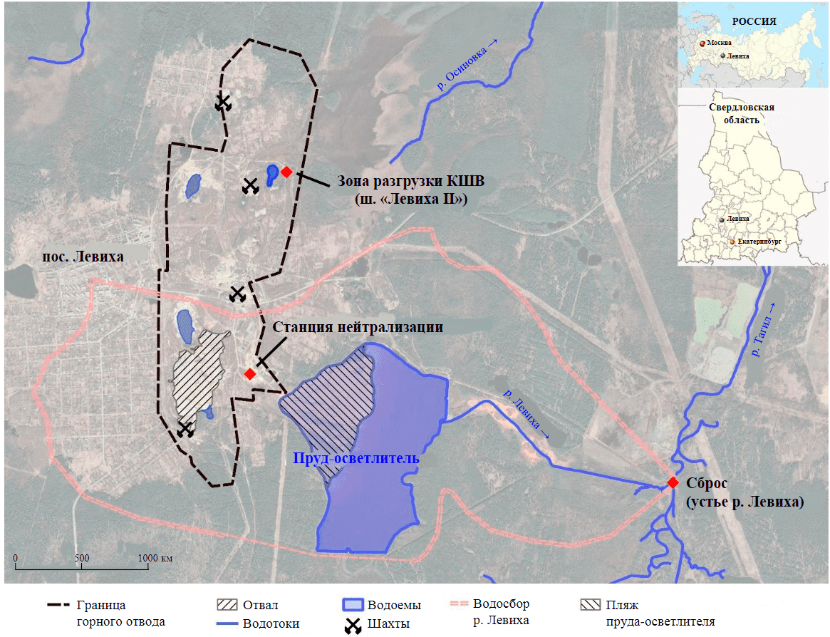 В Свердловской обл. на многих ликвидированных медноколчеданных рудниках (Левихинский, Карпушихинский, Ломовский, Дегтярский и др.) после прекращения водоотлива сформировались сосредоточенные выходы КШВ, как правило, в наиболее низкой части горнопромышленного ландшафта (в провалах, карьерах). Хотя их расход ниже, чем в период отработки и шахтного водоотлива, он может достигать несколько тысяч кубометров в сутки и без очистки приводит к деградации ландшафта и недопустимому загрязнению гидросферы на значительных площадях. Для предотвращения загрязнения окружающей среды таких объектов с начала 2000-х годов за счет средств областного бюджета организован сбор и нейтрализация КШВ (для этого было создано Государственное казенное учреждение Свердловской обл. «УралMонацит»). Очищенные сточные воды с Левихинского, Карпушихинского и Ломовского рудников сбрасываются в р. Тагил (Иртышский бассейновый округ), ниже сбросов расположено Леневское водохранилище, которое является одним из источников водоснабжения г. Нижний Тагил (население 350 тыс. чел.) [11]. Несмотря на очистку, уровень загрязнения воды в устье р. Левиха превышает допустимые нормы в тысячи и сотни раз [12].